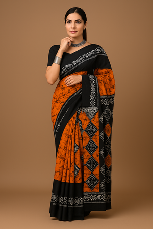 Black & Rust Orange Printed Saree with Tribal Motifs