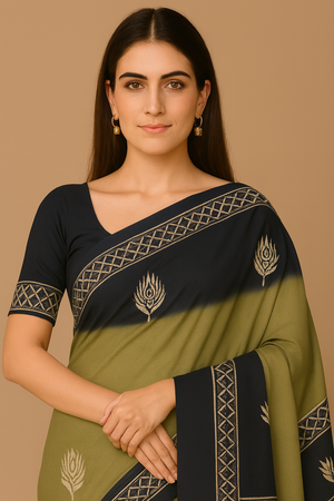 Elegant Linen Cotton Saree for Women – Olive Green & Navy Printed Saree