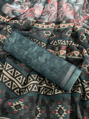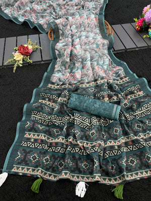 Handloom Linen Cotton Saree with Digital Print & Fancy Latkan