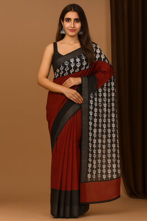 Embrace bold elegance with this Maroon & Black Linen Cotton Saree, crafted for the modern woman who loves timeless classics with a touch of art. The rich maroon body paired with a deep black pallu featuring intricate white motifs creates a stunning visual contrast.