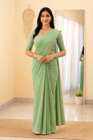 Its soothing pastel green shade paired with a stunning contrast printed blouse adds a stylish twist—perfect for women who prefer simple yet classy fashion. The saree’s smooth texture, fluid drape, and neat pleats make it ideal for beginners and saree lovers alike.