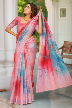 Add a splash of soft elegance to your wardrobe with this Pastel Pink & Multicolour Printed Linen Saree. The gentle pink base adorned with delicate watercolour-style floral prints gives it a fresh, contemporary vibe. The lightweight linen-style fabric drapes beautifully and offers comfort through long hours.