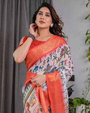 Pure Handloom Linen Saree with Floral Print & Zari Border