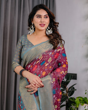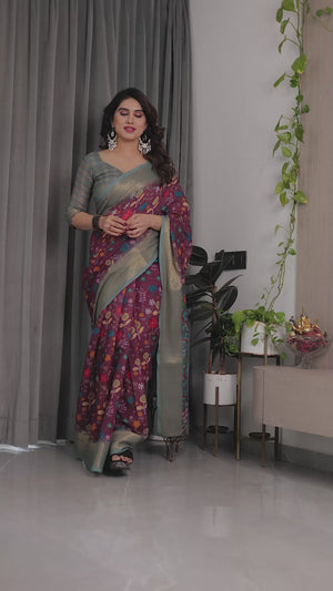 Fabric: Pure Handloom Linen with Digital Floral Print & Zari Border