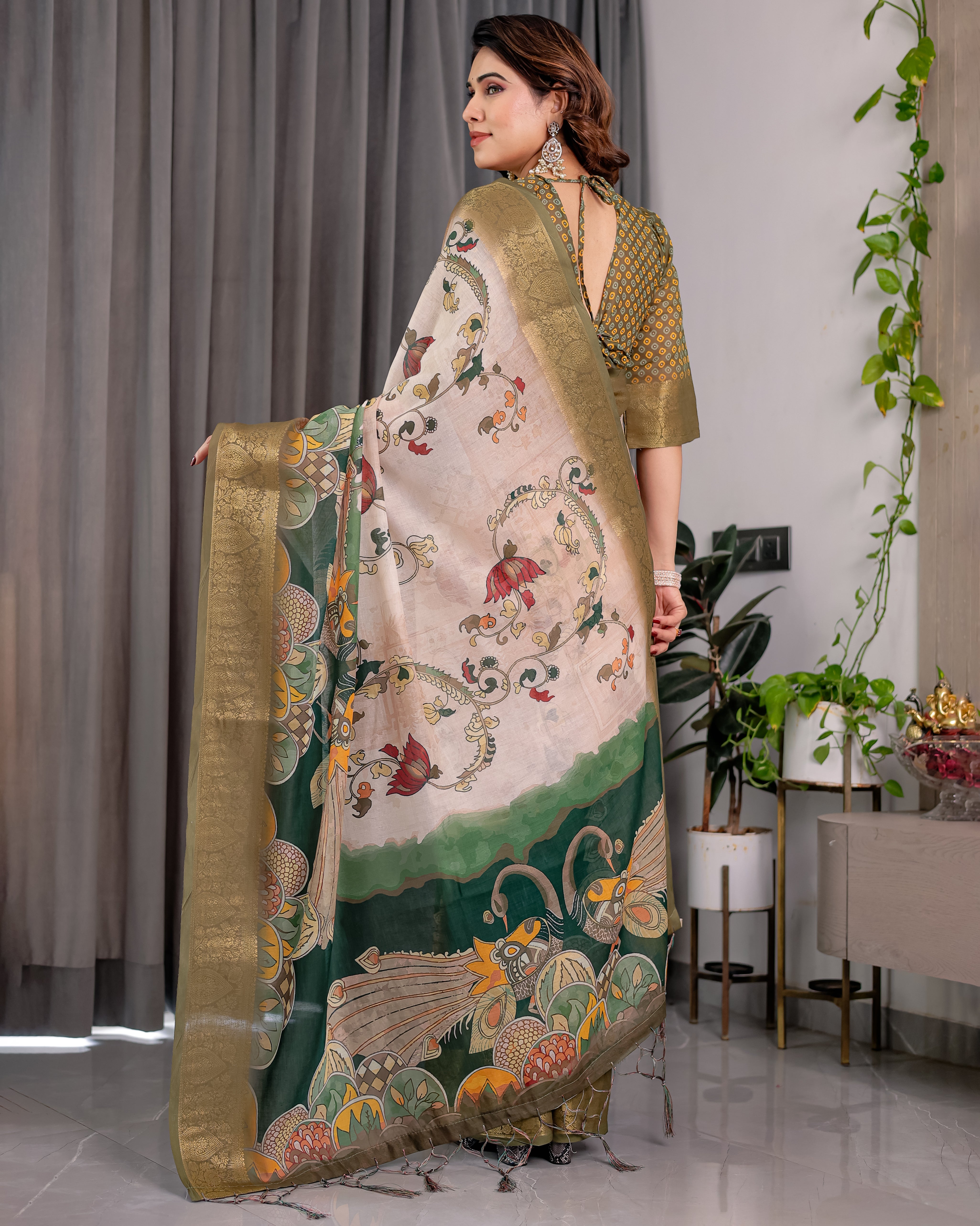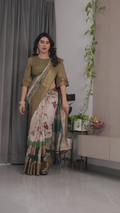 Pure Handloom Linen Saree with Floral Print & Zari Border | Elegant Ethnic Wear for Festive & Casual Styling