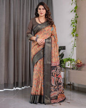 Elegance blends with comfort in this pure handloom linen saree from our premium collection. Designed with digital floral prints and complemented by a rich zari-woven border, it drapes gracefully for any occasion. The pallu is finished with chic tassels, adding a touch of charm to its timeless appeal.