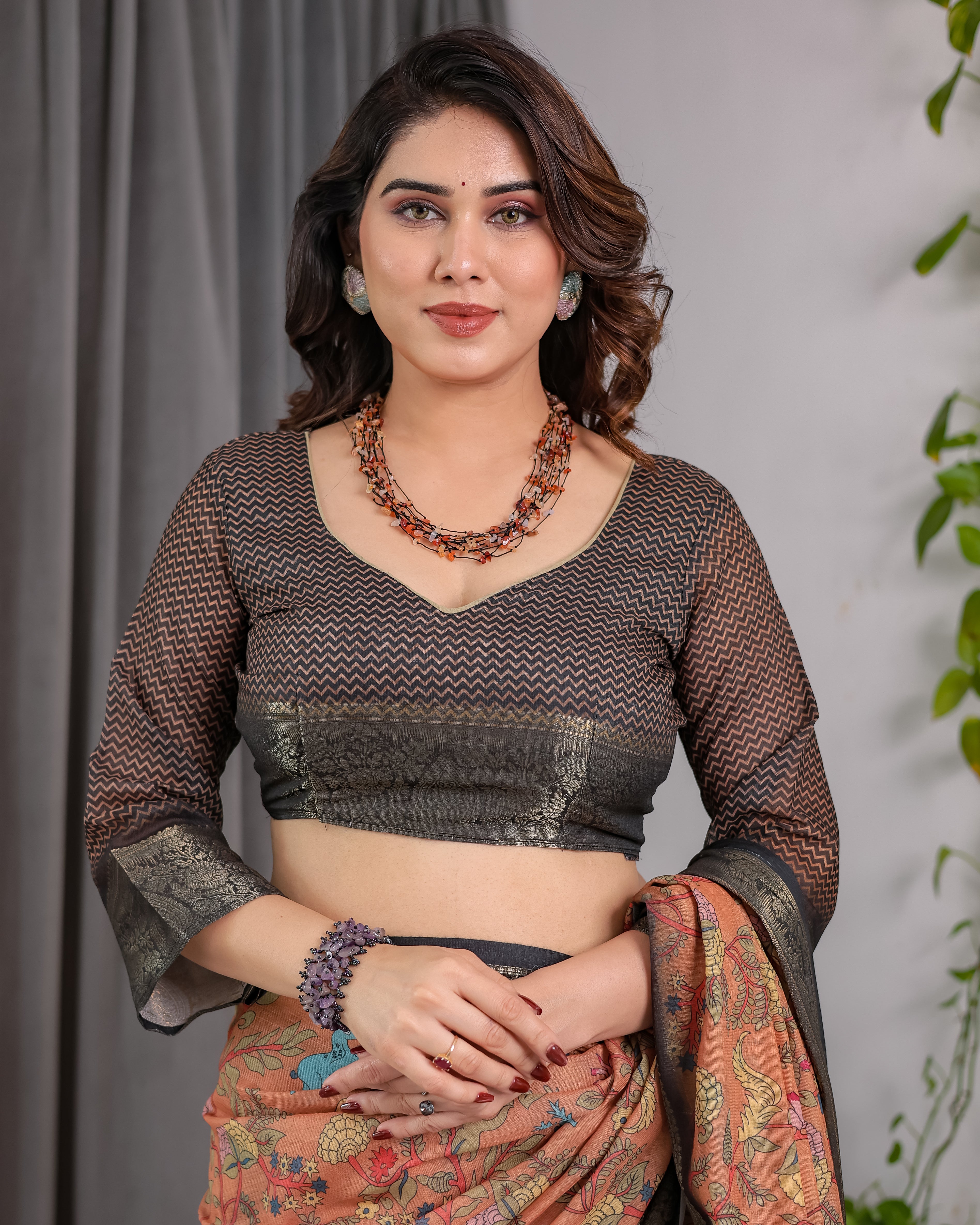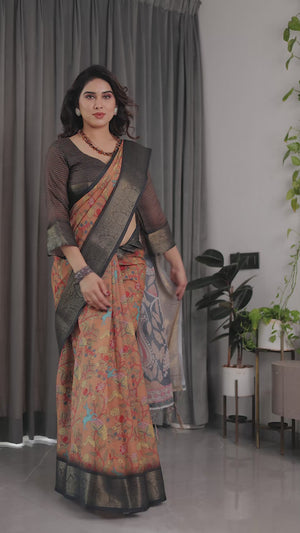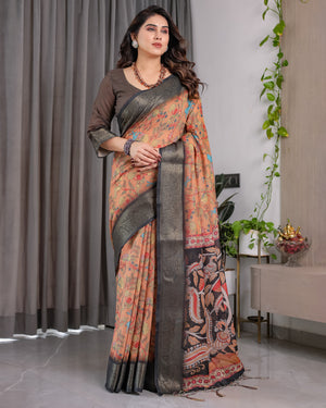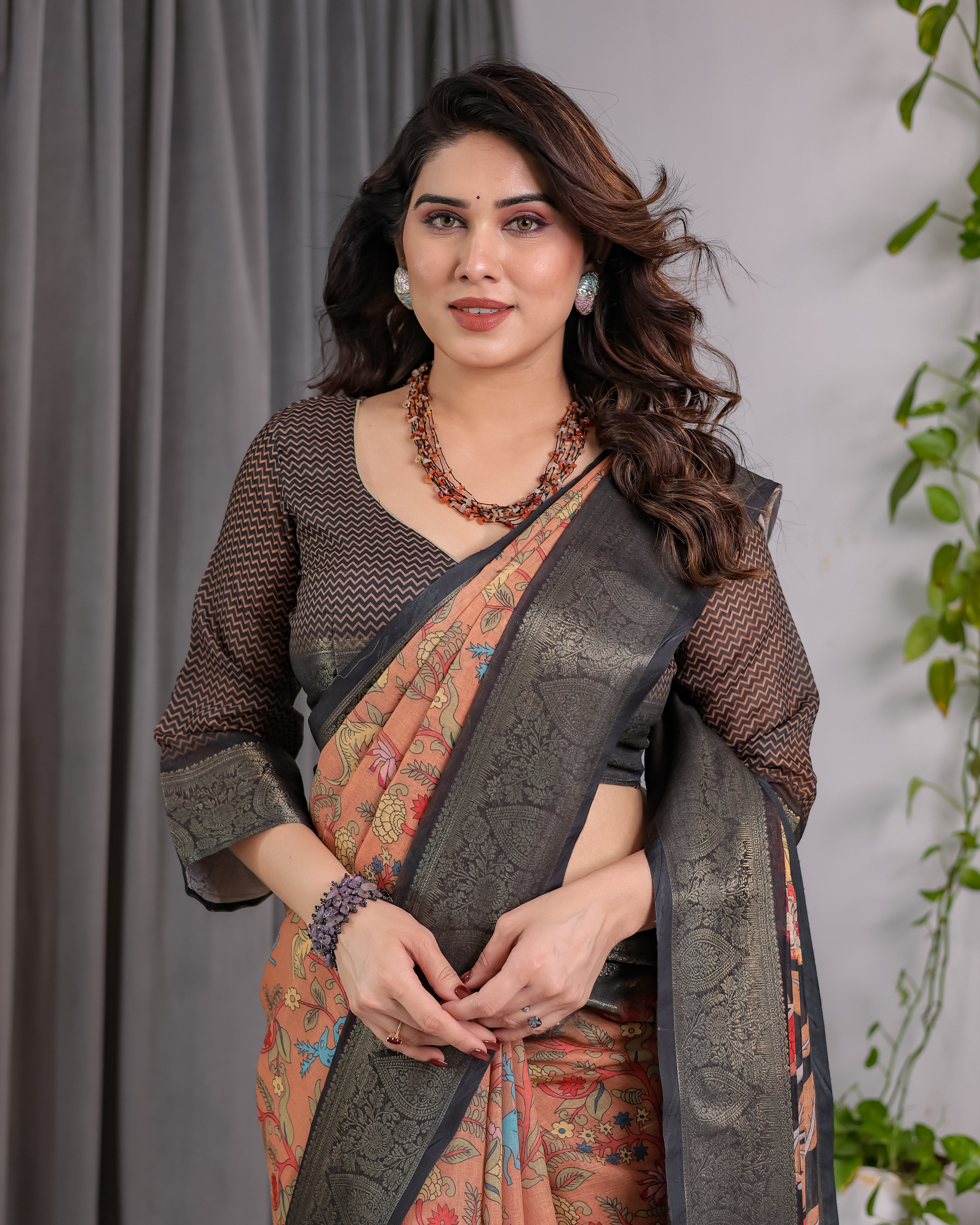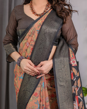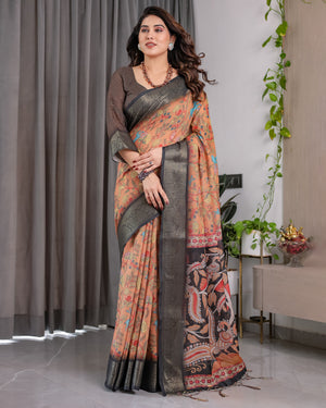 Pure Handloom Linen Saree with Floral Print & Zari Border | Elegant Ethnic Wear for Festive & Casual Styling