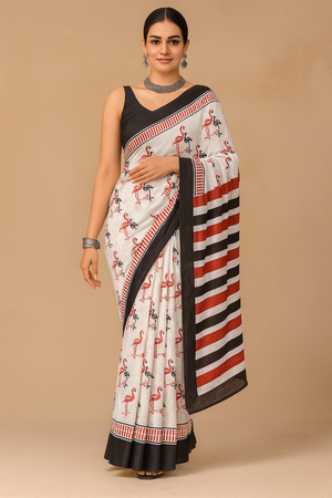 White & Black Cotton Linen Flamingo Print Saree