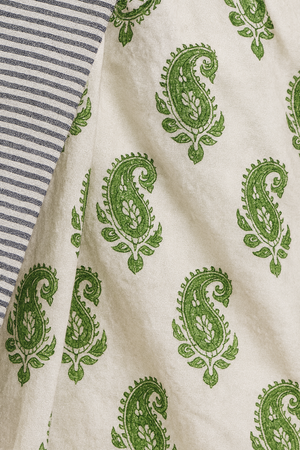 White & Grey Linen Saree with Green Paisley Print & Striped Pallu